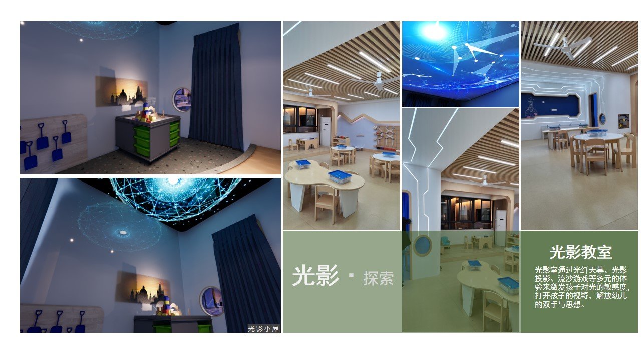 科创教室 设计以“星际探索·创想启航”为核心,打造一个沉浸式的幼儿科创启蒙空间。整体色调以深空蓝、科技灰为主,搭配柔和的暖木色作为缓冲,既保留了科技感的冷峻,又通过圆润的边角、软质的地面处理,保障幼儿活动安全。入口旁的任务展示墙,结合电子屏滚动播放航天科普动画,既是视觉焦点,也是知识导入的窗口。中央设置互动屏与模块化操作台,可开展机器人互动、简易电路搭建等科创游戏,让孩子在动手实践中理解基础科学原理。靠窗区域的开放式收纳柜,陈列科普绘本、实验器材与半成品教具,方便孩子自主取用,支持随时迸发的创想。里面设置沙坑和光影室,它通过沉浸式场景激发孩子的探索欲,通过互动式游戏培养问题解决能力,通过自主式探索建立科学思维,为未来的科创素养打下坚实基础。