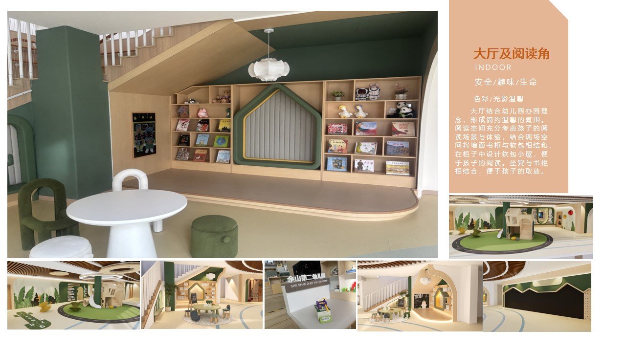 阅读空间 设计以“林间书屋·悦读栖居”为核心,依托建筑的坡顶结构,打造一个充满自然感与安全感的沉浸式阅读空间。将幼儿园的每一寸空间都利用起来,在楼梯间下方将自然意象融入空间之中,让孩子仿佛置身于森林中的秘密阅读基地,在松弛、温暖的氛围中亲近书籍,实现“以境引读、以读润心”的启蒙目标。以浅木色为基底,搭配深绿色墙面与软装,模拟森林的色彩质感。墙面嵌入的“树洞”造型卡座,搭配柔软的靠垫,为孩子提供了专属的私密阅读角落,既满足了幼儿对“小空间”的安全感需求,又强化了林间书屋的场景代入感。