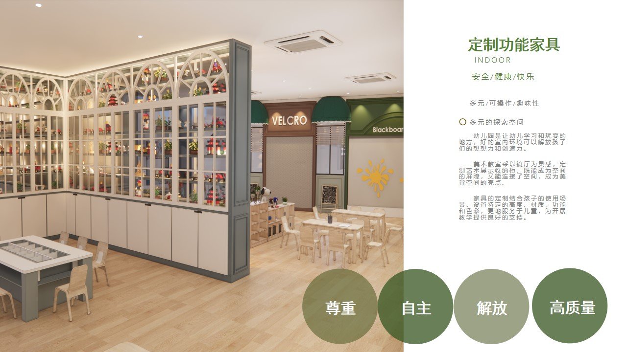 主题鲜明·童趣赋能·功能复合 定制家具设计依据环境特色及功能进行幼儿家具的设计,摒弃成人化、标准化的冰冷家具,将幼儿的行为习惯、心理特征与审美需求融入每一件定制家具中。通过圆角化、模块化、可移动、可收纳**的设计手法,让家具不仅是实用工具,更是空间的有机组成部分,为幼儿营造充满安全感、探索欲与仪式感的专属成长天地。
