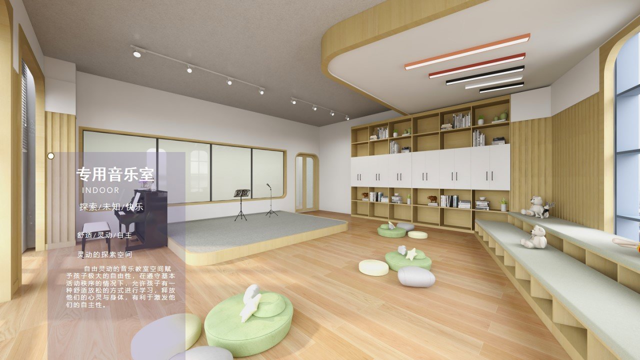 音乐教室 设计以“律动自然·声趣共生”为核心,打造一个兼具专业性与童趣感的音乐启蒙空间。空间内大量使用原木、棉麻等自然材质,搭配柔和的米白、浅木色调,营造出温暖松弛的感官体验。地面采用防滑环保地板,舞台边缘设置低矮防护栏,全方位保障孩子活动安全。舞台周边的开放区域铺设温润的原木色地板,搭配造型圆润的豆包坐垫与地垫,孩子可席地而坐进行节奏游戏、即兴舞蹈,也可围坐成圈开展小组音乐活动,让孩子在自由舒展的环境中感知节奏、释放天性。