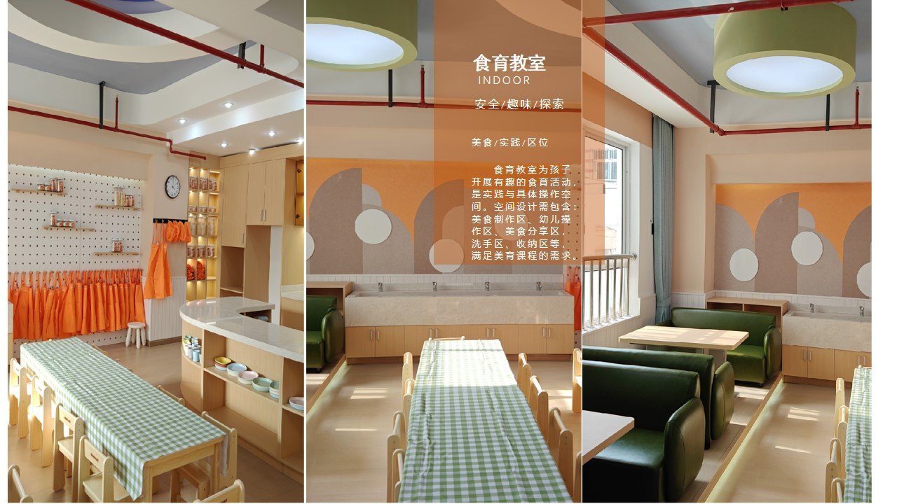 食育教室 设计以“食育+美育”为双核心,打造一个“五感浸润·创食共生”的复合型美育空间。它打破传统教室单一的功能属性,将美食制作、审美感知与生活实践深度融合,让孩子在揉面、摆盘、品尝的过程中,通过触觉、视觉、味觉的多元体验,建立对“美”的具象认知,实现“生活即美育”的教育目标。空间以暖橙、浅灰、米白为主色调,墙面用圆润的几何色块模拟食材肌理,既呼应食育主题,又以柔和的视觉语言降低孩子的陌生感。空间布局遵循“备料—制作—分享”的美食创作动线,划分出工具收纳区、操作区、分享区三大功能模块。洞洞板挂墙可灵活悬挂厨具,既是实用收纳,也是可变化的视觉装置;中岛操作台满足小组协作创作;靠窗的沙发卡座则营造出温馨的分享场景,让孩子在完整的创作闭环中,体验从“劳作”到“审美”的美育过程。