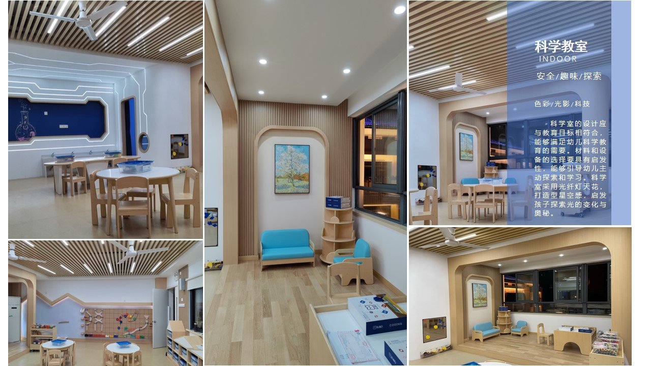 科创教室 设计以“星际探索·创想启航”为核心,打造一个沉浸式的幼儿科创启蒙空间。整体色调以深空蓝、科技灰为主,搭配柔和的暖木色作为缓冲,既保留了科技感的冷峻,又通过圆润的边角、软质的地面处理,保障幼儿活动安全。入口旁的任务展示墙,结合电子屏滚动播放航天科普动画,既是视觉焦点,也是知识导入的窗口。中央设置互动屏与模块化操作台,可开展机器人互动、简易电路搭建等科创游戏,让孩子在动手实践中理解基础科学原理。靠窗区域的开放式收纳柜,陈列科普绘本、实验器材与半成品教具,方便孩子自主取用,支持随时迸发的创想。里面设置沙坑和光影室,它通过沉浸式场景激发孩子的探索欲,通过互动式游戏培养问题解决能力,通过自主式探索建立科学思维,为未来的科创素养打下坚实基础。