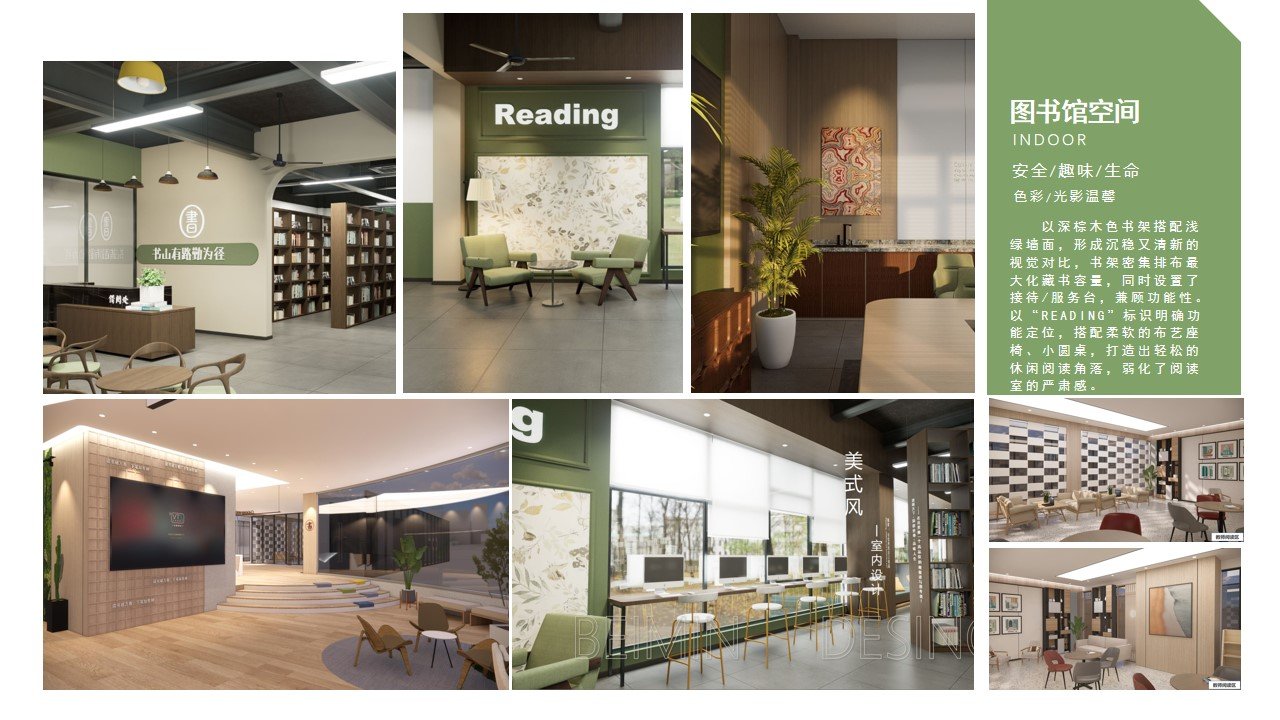 阅读空间 设计以“林间书屋·悦读栖居”为核心,依托建筑的坡顶结构,打造一个充满自然感与安全感的沉浸式阅读空间。将幼儿园的每一寸空间都利用起来,在楼梯间下方将自然意象融入空间之中,让孩子仿佛置身于森林中的秘密阅读基地,在松弛、温暖的氛围中亲近书籍,实现“以境引读、以读润心”的启蒙目标。以浅木色为基底,搭配深绿色墙面与软装,模拟森林的色彩质感。墙面嵌入的“树洞”造型卡座,搭配柔软的靠垫,为孩子提供了专属的私密阅读角落,既满足了幼儿对“小空间”的安全感需求,又强化了林间书屋的场景代入感。