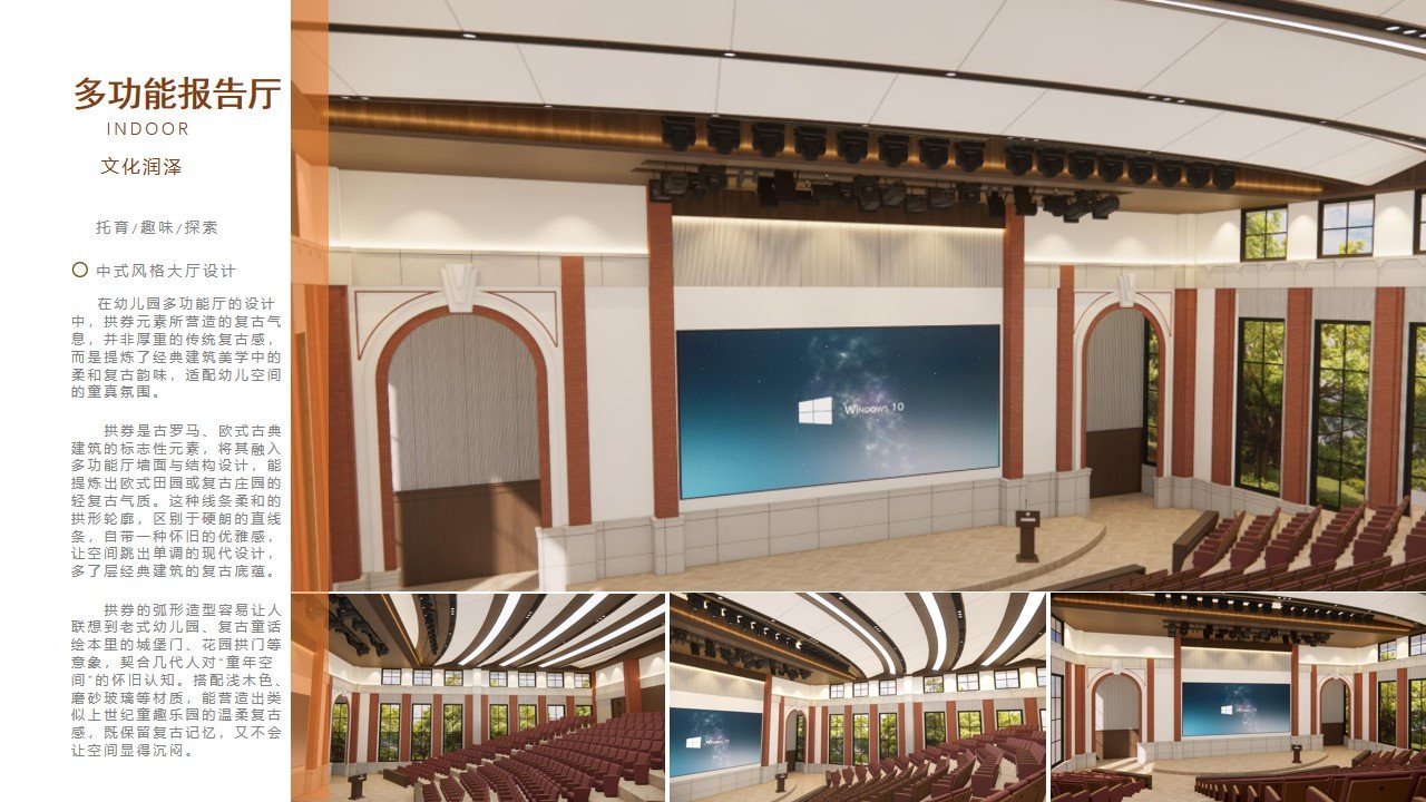 多功能厅设计 以“童趣赋能·成长仪式·情感共鸣”为核心,将空间设计与幼儿教育理念深度融合。通过柔和的色彩、圆润的造型营造开放、温暖、充满探索性的氛围;同时兼顾实用性与安全性,满足集体活动、艺术展示、教学互动等全场景需求,成为幼儿园文化传播与幼儿成长的核心载体。严格遵循《托儿所、幼儿园建筑设计规范》(JGJ39-2016,2019年版)及《建筑设计防火规范》(GB50016)要求:多功能活动室使用面积按每人0.65㎡配置,且不小于90㎡;净高≥3.6m,满足空间健康需求;门窗、防护栏杆、疏散通道等均符合幼儿安全标准;生活用房不设于地下室、半地下室,三层及以下布局,便于幼儿通行与应急疏散;地面、墙面、采光通风等均适配幼儿身心特点,确保空间安全、适用、环保。 |