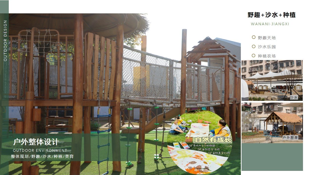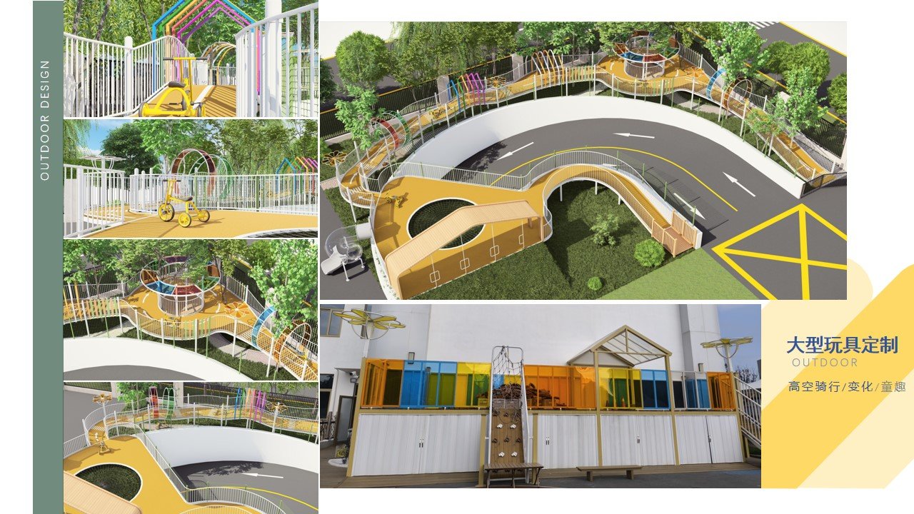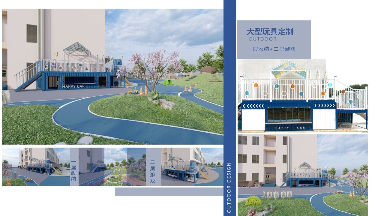 空间复合·趣玩收纳 底层:集约收纳空间 - 采用集装箱式模块化箱体设计,划分出多个封闭收纳隔间,可分类收纳骑行小车、建构积木、户外教具等各类物品。 - 配置双开式防滑门与标识化分区,方便老师快速存取、归位玩具,也能引导孩子参与收纳整理,培养良好的收纳习惯。 - 箱体底部做防潮处理,搭配通风百叶,避免玩具受潮损坏,延长教具使用寿命。 上层:童趣游戏平台 - 以开放式观景平台为核心,铺设防滑实木地板,搭配带彩色装饰的安全护栏,保障孩子活动安全。 - 平台设置趣味瞭望区与小型攀爬点,边缘连接滑梯与缓坡通道,形成“登高探索+快速滑行”的游戏动线。 - 顶部增设半透明遮阳棚,有效遮挡日晒雨淋,让游戏空间不受天气影响,提升使用时长。
