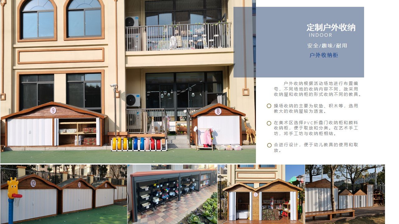 收纳空间 户外防腐木收纳柜主体采用实木框架与环保板材,打造错落的坡顶“小木屋”造型,与幼儿园户外自然氛围高度适配,同时通过编号标识实现分区管理,提升收纳的秩序感。柜体根据收纳需求划分为大容积储物区与分层置物区,大空间用于收纳软垫、大型积木等教具,分层格架则适配球类、手工材料等小型物品,实现精细化分类存放。PVC折叠门采用轻型轨道设计,可向单侧完全收拢,开启时不占用额外空间,教师与幼儿可轻松存取大型教具;闭合时则形成完整封闭面,有效阻挡灰尘、雨水,保护教具不受户外环境侵蚀。